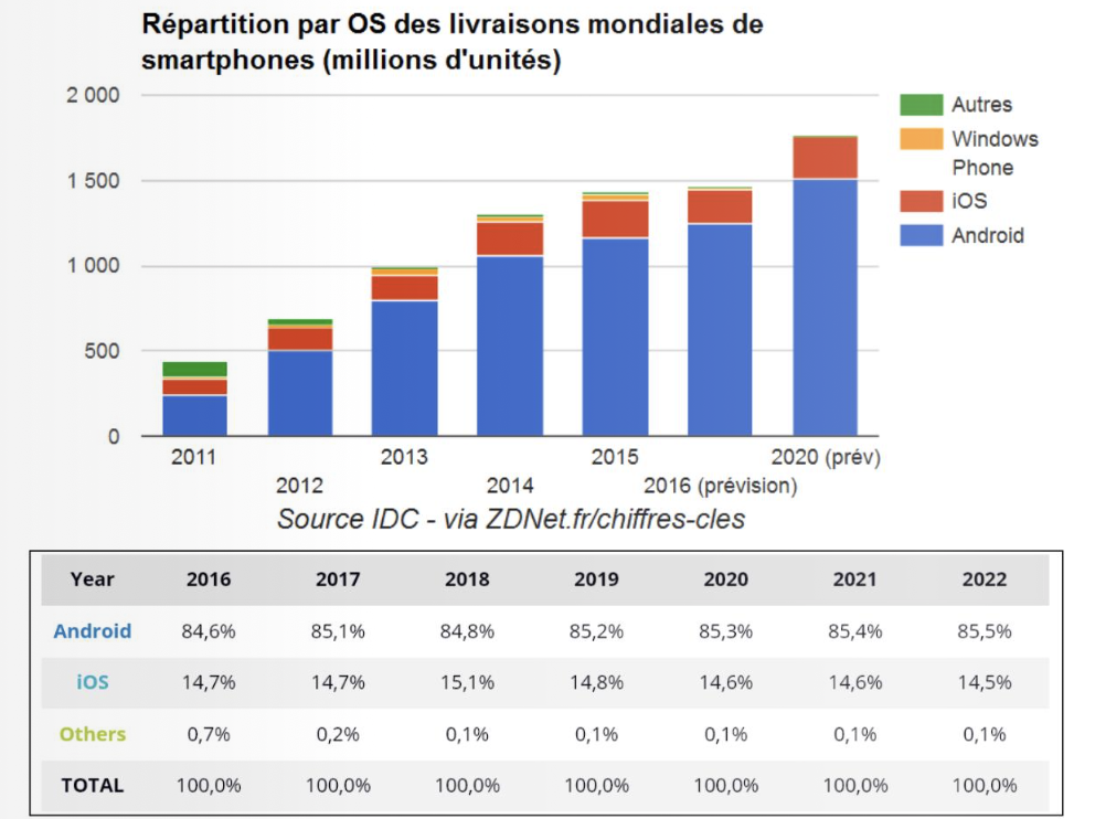 D'après Forrester, 66% de la population mondiale sera équipée d'un smartphone en 2022, soit 3,8 milliards de terminaux. iOS et Android représenteront alors 94% de parts de marché.