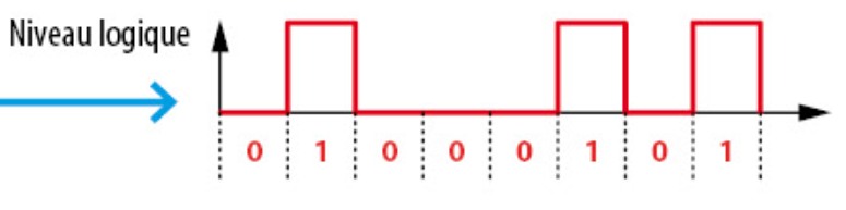Les informations sont transmises sous forme binaire : l'information est soit présente (notée 1), soit absente (notée 0). Les valeurs 0 et 1 sont appelés niveaux logiques.
