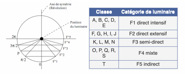 La répartition photométrique est caractérisée par les flux repérés de F1 à F5 conformément à la norme NF C 71-120.