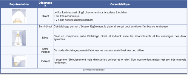 Ex : éclairage direct et intensif A, B, C, D, E ; indirect T